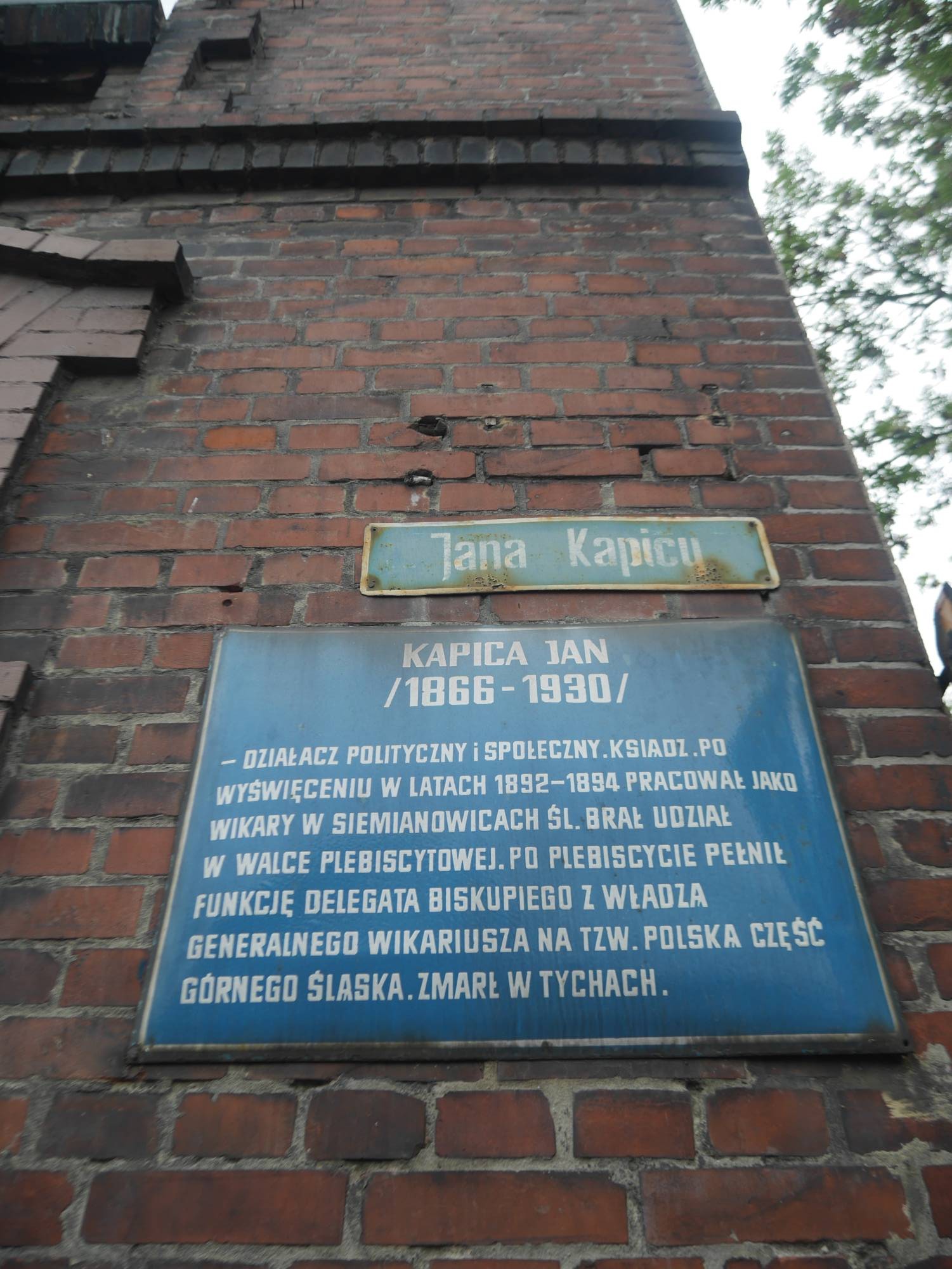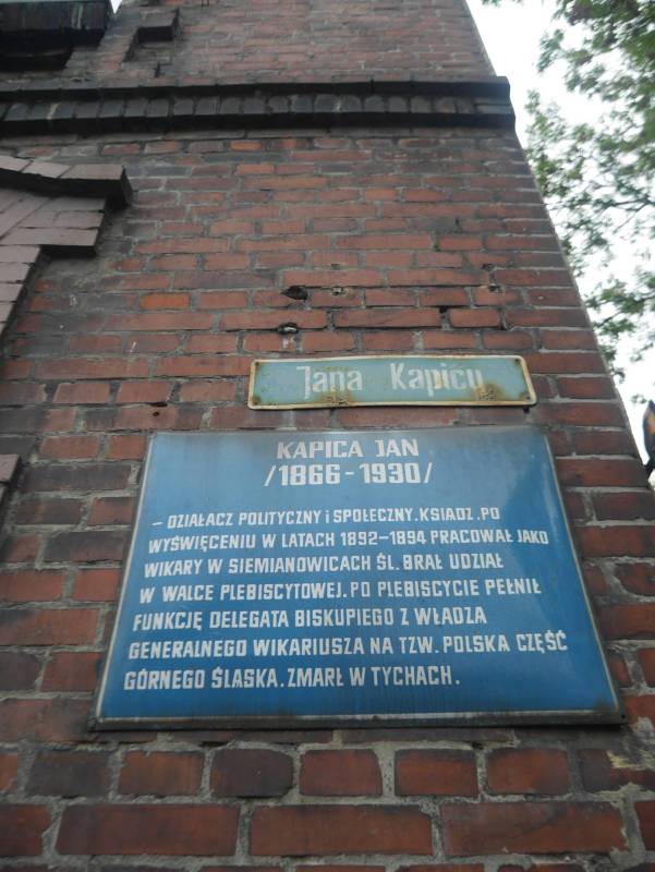 Upamiętnia ks. Jana Kapicę (1866–1930), katolickiego duchownego oraz aktywnego działacza społecznego i politycznego. Kapica ukończył gimnazjum w Pszczynie. Na przełomie wieków XIX i XX propagował ideę abstynencji. Od 1898 r. aż do śmierci w 1930 pełnił funkcję proboszcza parafii św. Marii Magdaleny w Tychach, gdzie przyczynił się do rozbudowy kościoła. Popierał partię Centrum i w 1908 r. został posłem do parlamentu pruskiego. Wcześniej, od 1892 r., był wikarym w parafii Podwyższenia Krzyża Świętego w Siemianowicach.