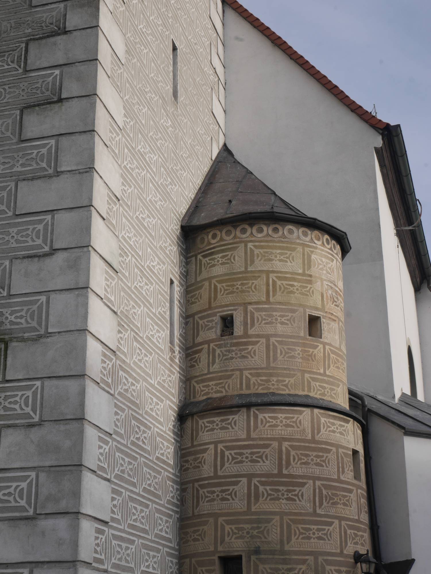 Elewacja frontowa posiada dwa portale zdobione motywami roślinnymi oraz kamienne balustrady balkonowe, wsparte na wolnostojących kolumnach.