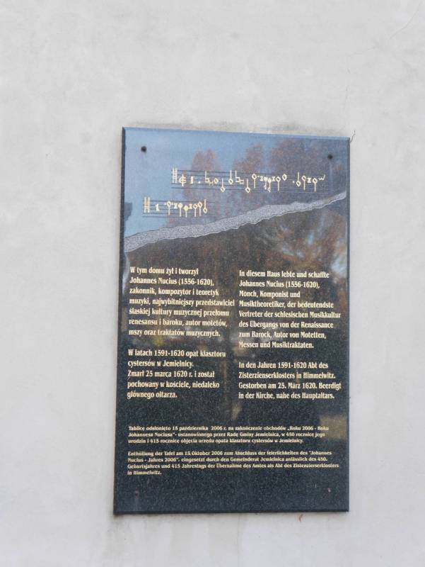 V bývalém cisterciáckém klášteře v Jemelnci, vedle dnešního farního kostela (po-klášterního chrámu) a legendární kaple sv. Vojtěcha, se nachází vzpomínka na mimořádného mnicha. Johannes Nucius žil v letech 1556-1620 a je považován za jednoho z nejpřednějších představitelů slezské hudební kultury na přelomu renesance a baroka. Mniší sliby složil v klášteře v Rudách a od 1591 do 1620 vykonával funkci opatů jemelnckého kláštera. Tuto funkci zastával až do své smrti -- zemřel v březnu 1620 a byl pochován v kostele, blízko hlavního oltáře. Přestože za své doby nezískala velkou slávu jako tvůrce, zanechal po sobě důležitý teoretický a kompoziční odkaz. Je známý především svým pojednáním Musices Poeticae (1613) o praxi kompozice v počátku sedmnáctého století, které bylo jedním z klíčových hudebních děl v přechodném období od renesance k baroku. Většina Nuciusových rukopisů se nezachovala; byly zničeny během požárů jemelnckého kláštera v 1617 a 1733. S cisterciáckým klášterem byl také spojen další vynikající skladatel baroko -- opatem Ludvíkem Bergelem.