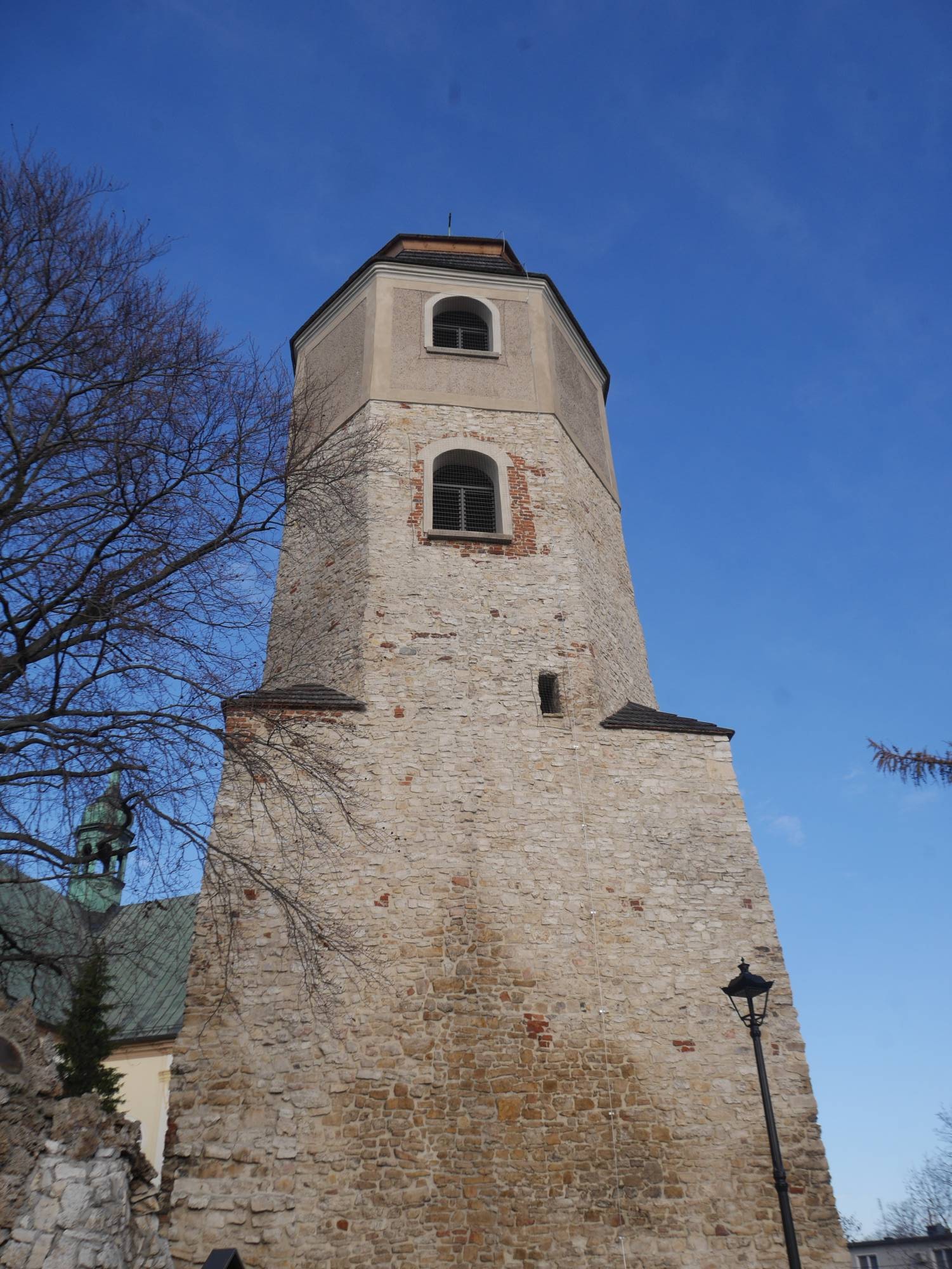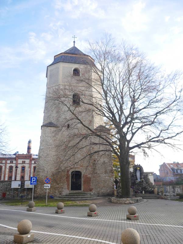 Věž, kterou dnes slouží jako zvonice farního kostela sv. Vavřince, je pozůstatkem bývalých hradeb města Strzelce Opolskie. Když se rozvíjející se středověké město obklíčilo obranné zdi, byl vedle kostela a tehdejšího hřbitova postaven věž. Stavba je datována do patnáctého století. Její masivní kamenná základna a vyšší patra vystavěná z cihel svědčí o typické středověké obranné architektuře. Nižší část má obdélníkový půdorys, zatímco vyšší podlaží přechází do osmibokého tvaru, čímž stavbě dává charakteristickou siluetu. Na přelomu sedmnáctého a osmnáctého století, s rozvojem farnosti, byla věž přestavěna a přeměněna na zvonici kostela sv. Vavřince. V posledních letech prošla věž důkladnou renovací, včetně opravy střechy, fasády a dřevěných prvků. Ačkoli byla zvažována její otevření návštěvníkům, strmé vnitřní schody stále vzbuzují obavy o bezpečnost. Dnes věž zůstává důležitým symbolem Strzelců Opolských a připomíná jejich středověkou pozici. Dodnes se v Strzelcích Opolských zachovaly jen fragmentární pozůstatky středověkých městských zdí. Kromě bývalé věže lze tyto fragmenty nalézt v jižní části města (ulice Konopnickiej, Zamkowa a Opolska).